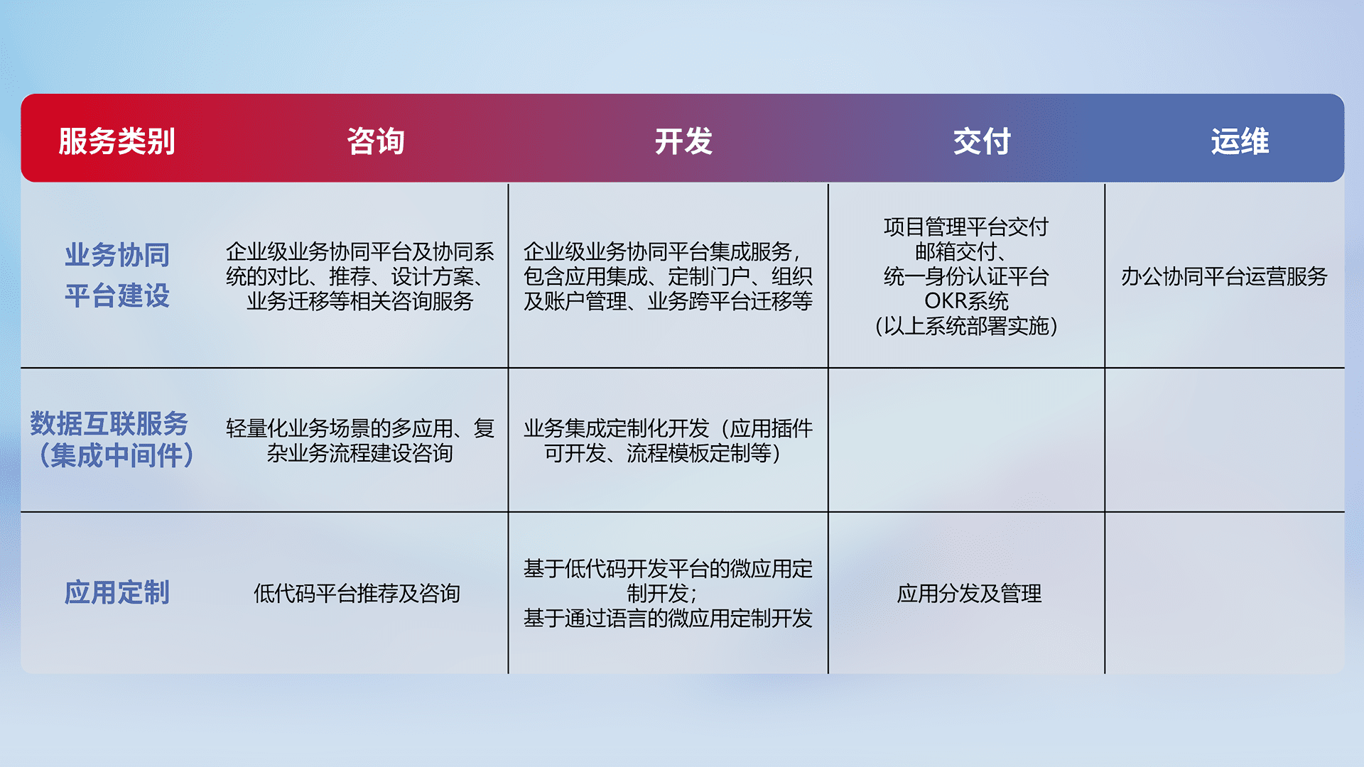 针对钉钉、、、企微、、IDaas等平台级产品提供产品的规划、、、方案、、交付、、定制化开发等服务,,实现如统一协同办公、、、智能客户服务、、、、混合会议管理、、、智能数据查询、、、、等业务场景,,,,实现数字化转型。。。